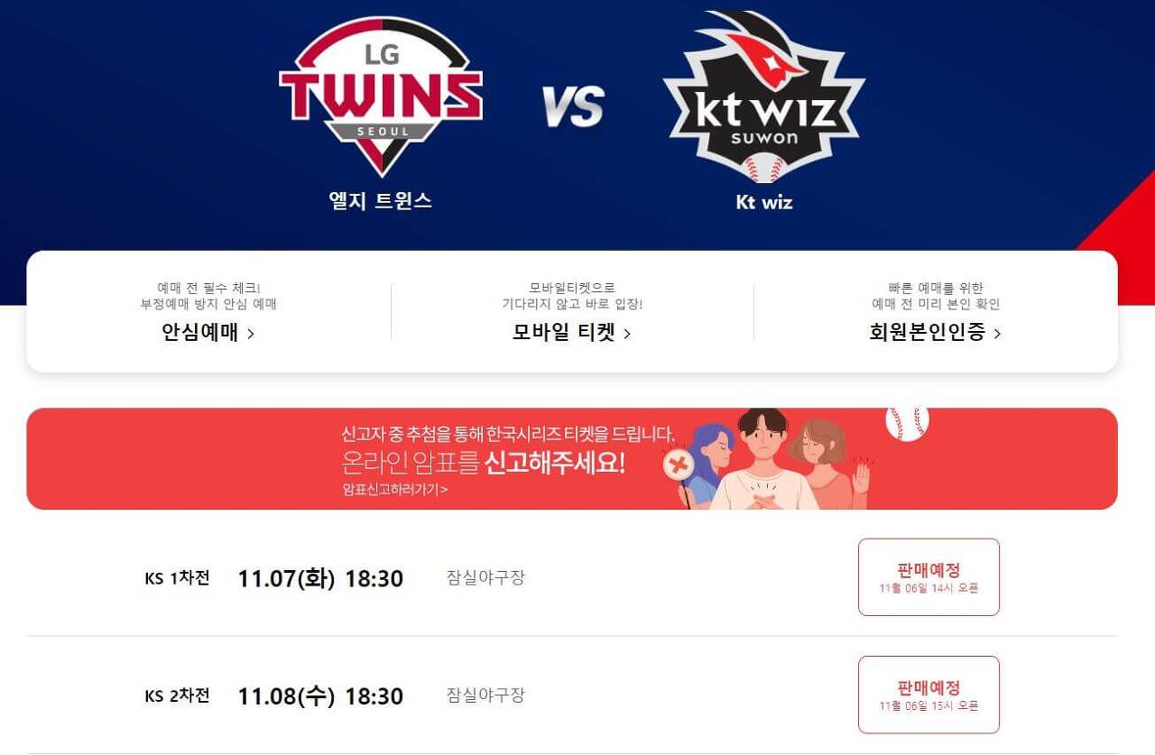 티켓 예매는 11월 6일부터 시작되었습니다. 아래 한국시리즈 티켓 예매하기를 클릭하시면 바로 확인하실 수 있습니다.